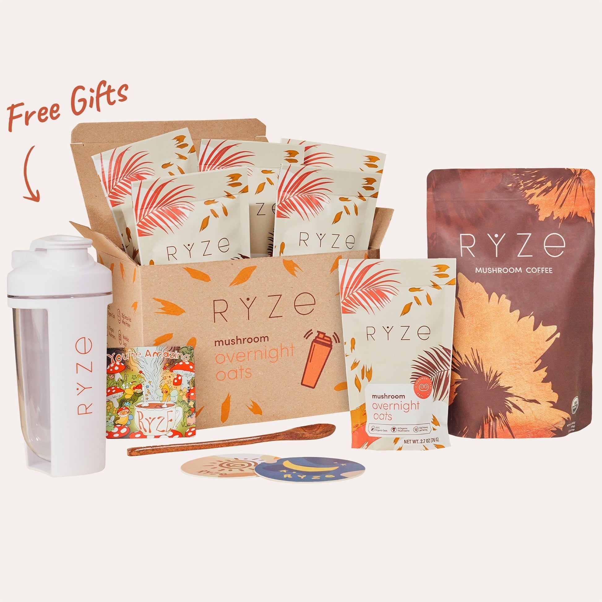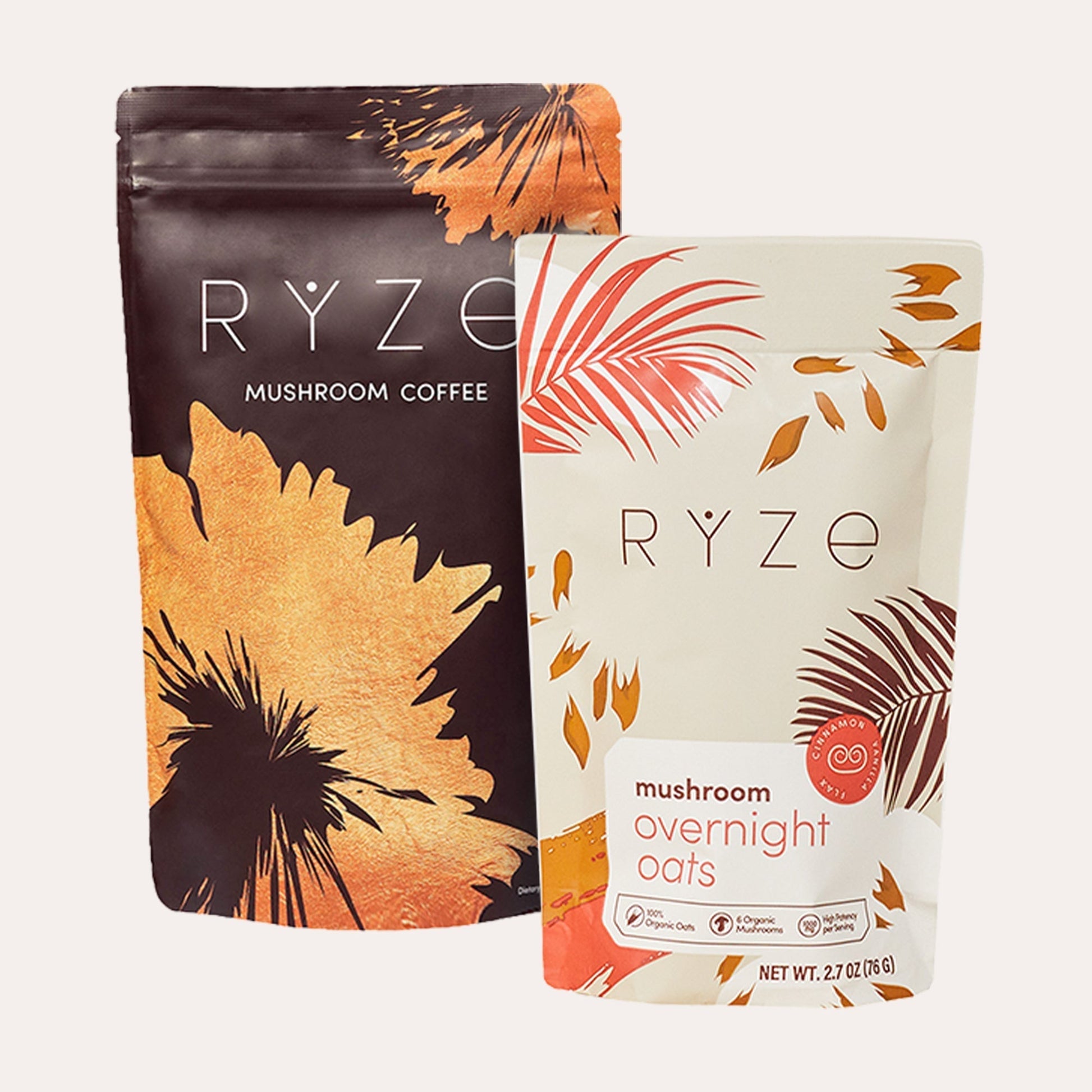 RYZE Breakfast Bundle combines our famous Mushroom Coffee with the tastiest. healthiest and quickest breakfast on the market. Both products featuring the health benefits of 6 adaptogenic mushrooms.