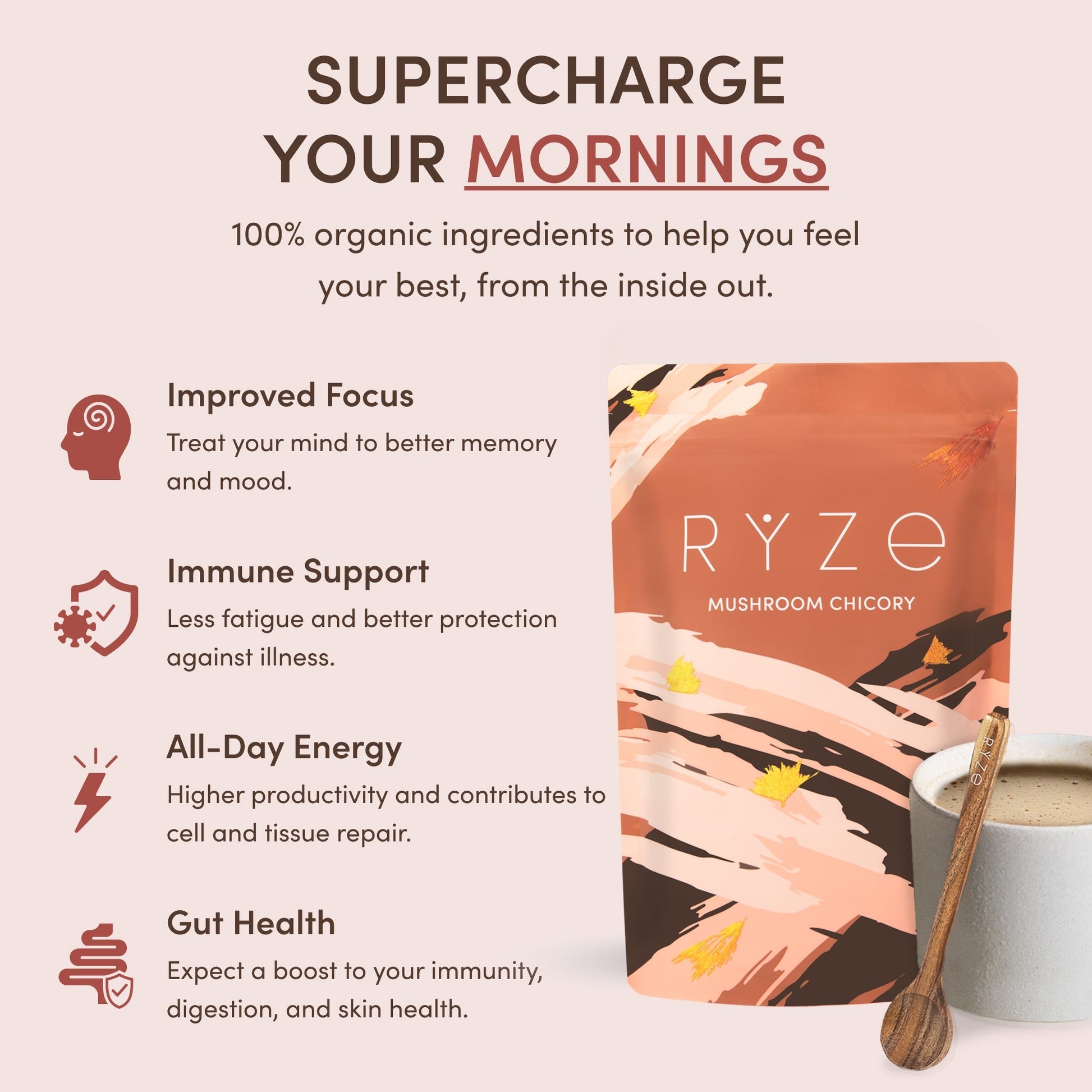 Our blend. enhanced with functional mushrooms and MCT. delivers calm energy that promotes focus. productivity. adrenal health. and ... yes. happiness. Our ingredients have been studied for thousands of years and found to enhance brain function. boost immunity. and give balanced energy that keeps you shining all day long. All with zero caffeine.