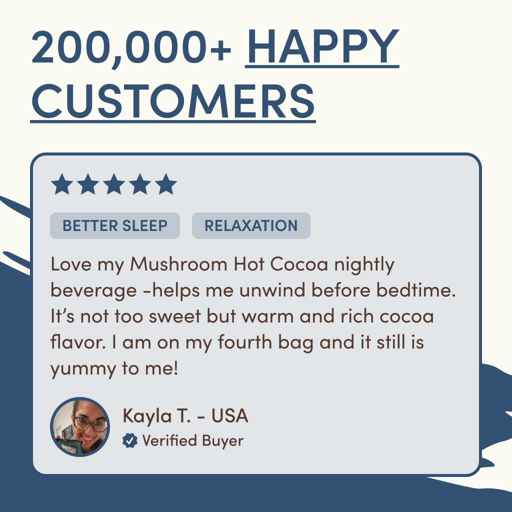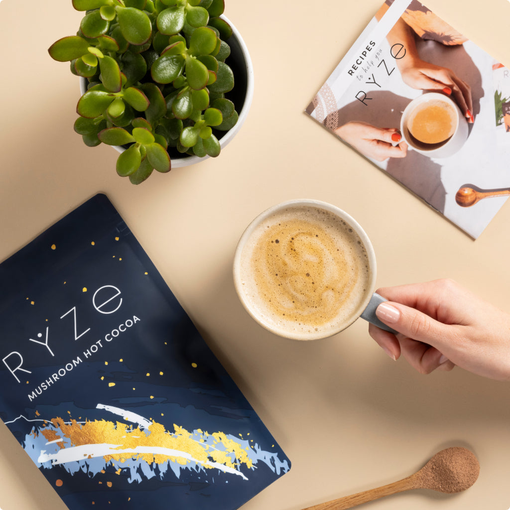 RYZE Mushroom Hot Cocoa. a nighttime treat that marries the magical calming powers of reishi with the snooze-inducing benefits of L-theanine. glycine and melatonin for a blend that helps you unwind at night and wake up refreshed in the morning. Blended with cacao powder for powerful antioxidants and coconut water for hydration. you'll start a better day the night before.